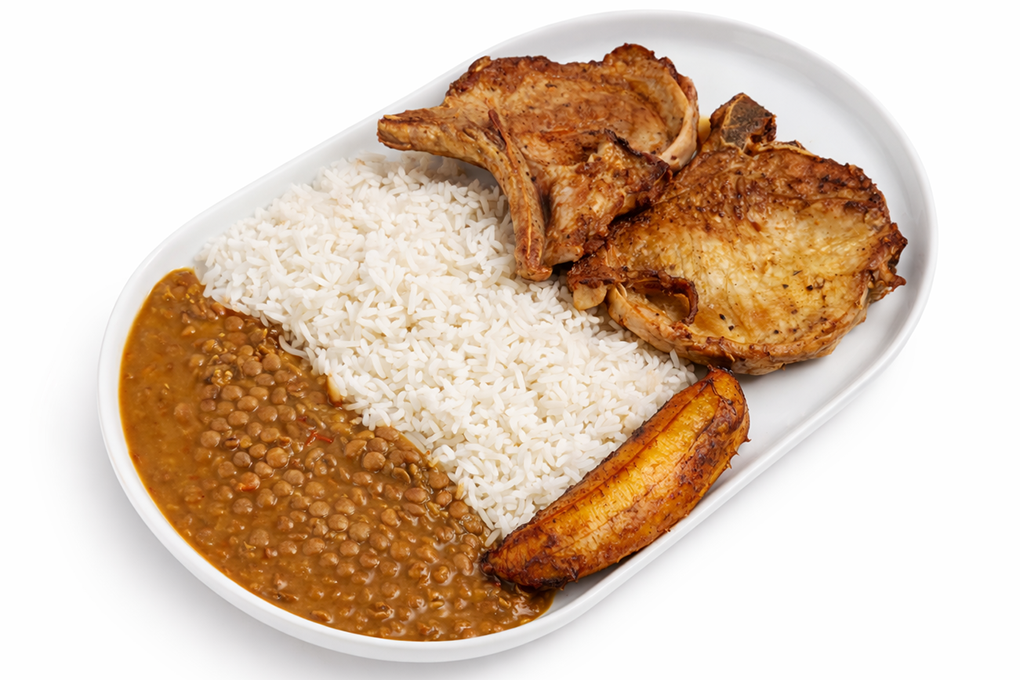 Dos chuleta de cerdo acompañada de menestra de lenteja, arroz y maduro frito.